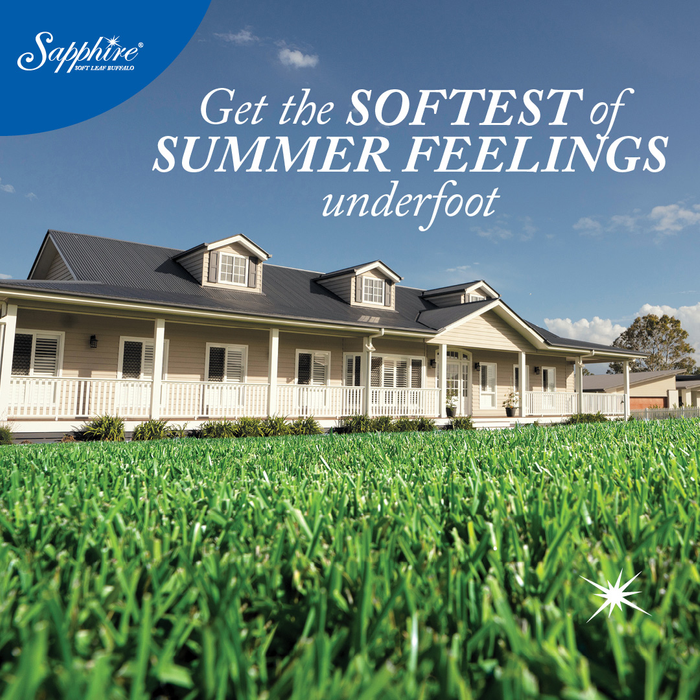 **PLEASE CALL FOR AVAILABILITY & PRICE*** Key Features: Sapphire Soft Leaf Buffalo lawn has all the benefits of the other high-performance Soft Leaf Buffalo grass such as needing less water deep roots greener in winter a good sun or shade lawn and hard wearing. However Sapphire Buffalo Turf has the added benefit of a finer texture and deep green colour. Sapphires deep-rooted system means it will stay greener for longer in dry summer conditions and requires less watering than most lawns. Sapphire Turf maintains excellent winter colour and is well suited to be grown in homes Australia-wide.